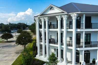 Exterior view of The White House Hotel, with white columns and an American flag on a sunny day