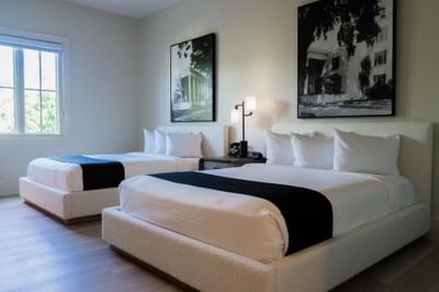King Bed Partial View Connector at The White House Hotel, with two queen beds, dark headboards, wood floor, and ceiling fan